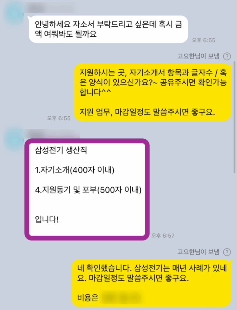 - >> 작업 진행 (초안 작성, 첨삭, 피드백): 맞춤형 자기소개서가 완성될 때까지 꼼꼼하게 진행합니다.