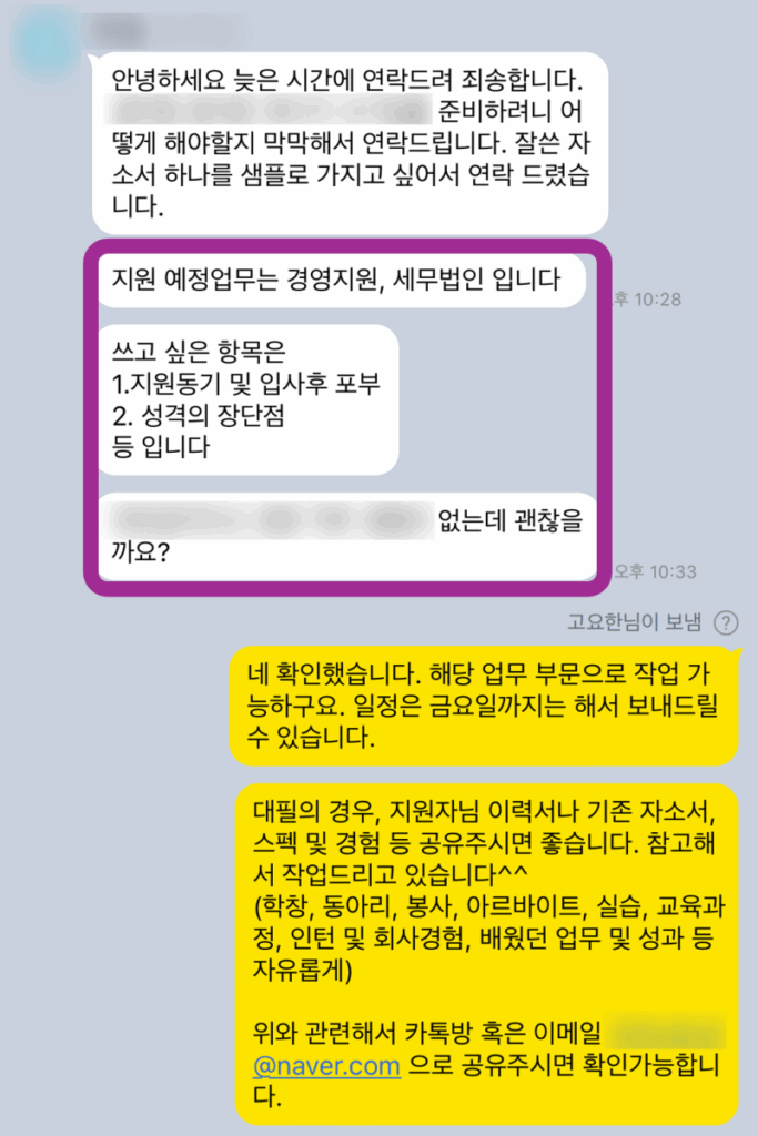 • >> 4단계: 심층 상담 및 작업 진행 (1:1 유선/온라인 상담을 통해 지원자님의 경험을 깊이 있게 파악하고, 자기소개서 대필/첨삭 작업을 진행합니다.)