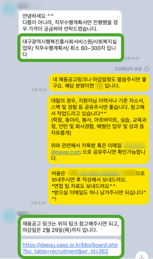 안녕하세요! 대기업 출신 자기소개서 컨설턴트입니다. 최근 대구행복진흥원 사회복지 분야 채용이 있었는데요, 많은 분들이 자기소개서 작성에 어려움을 겪으시는 것 같아, 제가 직접 첨삭했던 따끈따끈한 후기를 들고 왔습니다. 매년 2000명 이상 자소서 컨설팅을 진행하며 수많은 합격 사례를 만들어낸 경험을 바탕으로, 이번 대구행복진흥원 합격 전략을 아낌없이 풀어드리겠습니다!
