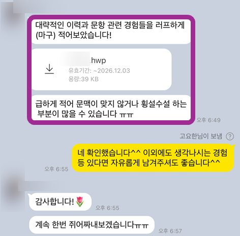 공유해주신 이력서와 자기소개서를 꼼꼼하게 검토한 후, 1:1 맞춤형 컨설팅을 진행했습니다. 지원자분의 강점과 경험을 분석하고, 삼정회계법인의 인재상과 직무 특성에 맞춰 자기소개서 내용을 재구성하는 데 집중했습니다. 특히, 채용공고를 기반으로 삼정회계법인이 원하는 인재상을 파악하고, 이를 자기소개서에 녹여내는 전략을 세웠습니다. 거의 대필 수준으로 갈아엎었어요! 고객님이 전에 쓰셨던 자소서를 들고 오셨는데, 글자 수도 안 맞고 문장도 그대로 첨삭하면서 거의 다시 짰다고 봐야 해요 제발 다음엔 하루 전에는 와주셔요..! 진짜 그래야 저도 여유 있게 도와드릴 수 있거든요