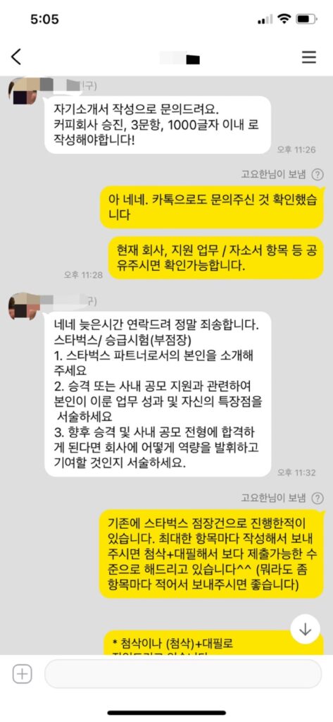 이번 시간에는 스타벅스 부점장 승진 채용에 지원하신 분의 자기소개서 첨삭 후기를 공유하고자 합니다. 서류 전형에서 번번이 고배를 마시던 지원자님께서 저의 컨설팅을 통해 최종 합격이라는 기쁜 소식을 전해주셨습니다. 지금부터 그 비법을 아낌없이 풀어드리겠습니다!