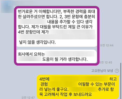 공유해주신 이력서와 자기소개서를 토대로, 1:1 맞춤형 컨설팅을 진행했습니다. 먼저, 지원자분의 강점과 약점을 분석하고, 인천국제공항공사의 인재상과 핵심 가치에 부합하는 경험을 찾아내는 데 집중했습니다. 그 다음, 각 문항별로 어떤 내용을 담아야 할지, 어떤 방식으로 표현해야 할지 함께 고민하고, 구체적인 작성 전략을 수립했습니다. 첨삭 과정에서는 문장 하나하나 꼼꼼하게 검토하고, 불필요한 내용은 삭제하고, 핵심 내용을 강조하는 방식으로 진행했습니다. 진짜 이건 거의 대필 수준으로 갈아엎었어요! 고객님이 전에 쓰셨던 자소서를 들고 오셨는데, 글자 수도 안 맞고 문장도 어색해서 첨삭하면서 거의 다시 짰다고 봐야 해요 제발 다음엔 하루 전에는 와주셔요..! 진짜 그래야 저도 여유 있게 도와드릴 수 있거든요