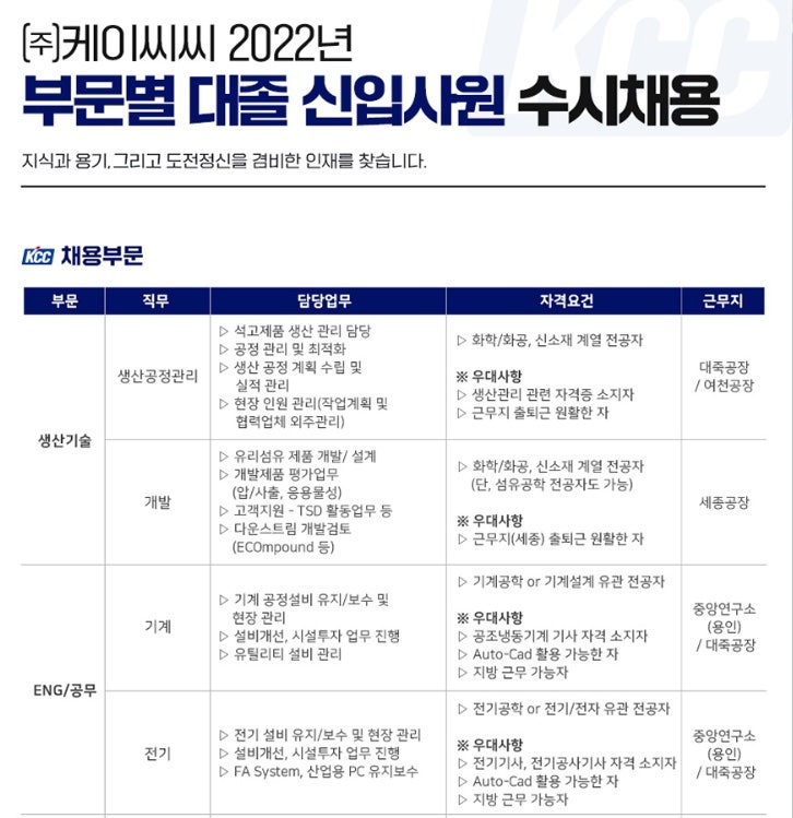 KCC 생산기술 직무는 생산 설비의 유지 보수 및 효율적인 관리를 통해 생산성을 향상시키는 중요한 역할을 담당합니다. 주요 업무는 다음과 같습니다.