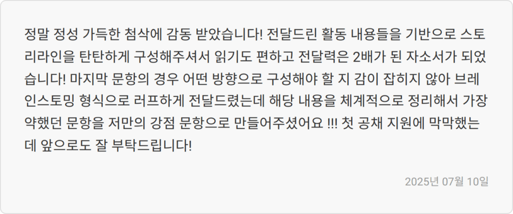 아래 이미지는 자기소개서 작성과 첨삭 과정을 통해 자신감을 얻은 지원자의 후기와 현장감 있는 사진입니다. 클릭 시 카카오 채널로 연결되어 더 많은 정보를 확인할 수 있습니다.