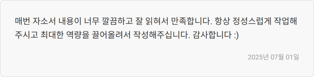 각 산업군별 특성과 기업의 평가 기준을 반영하여, 단순한 문법 교정을 넘어 논리적 구성, 경험의 구체화, 차별화된 자기표현까지 완성도 높은 자소서를 제공합니다.