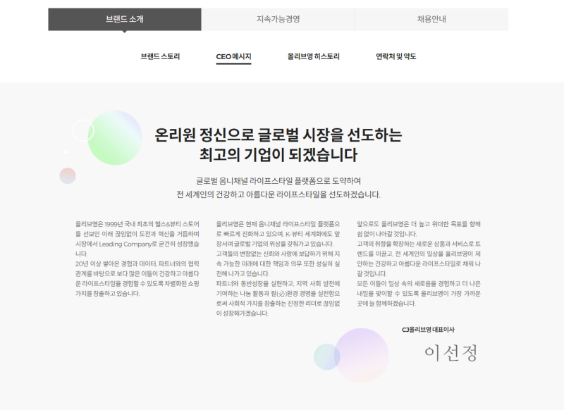 CJ올리브영은 CJ그룹의 헬스&뷰티 스토어입니다. 단순히 화장품을 판매하는 곳이 아닌, 고객에게 새로운 트렌드를 제안하고 경험을 제공하는 공간이죠. 최근에는 온라인 플랫폼 강화와 함께 O2O 서비스를 확대하며 옴니채널 리테일러로서의 입지를 다지고 있습니다. CJ올리브영은 건강한 아름다움이라는 핵심 가치를 바탕으로 고객에게 최상의 뷰티 솔루션을 제공하며, Life-styling Curator라는 비전을 향해 나아가고 있습니다. 특히 MZ세대의 트렌드를 선도하며 뷰티 시장을 혁신하고 있다는 평가를 받고 있습니다.