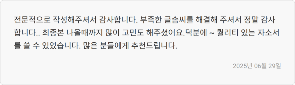 오랜 기간 수많은 지원자들의 자소서를 검토해온 경험에 비추어 볼 때, 자소서 첨삭은 합격 가능성을 크게 높이는 필수 과정입니다.